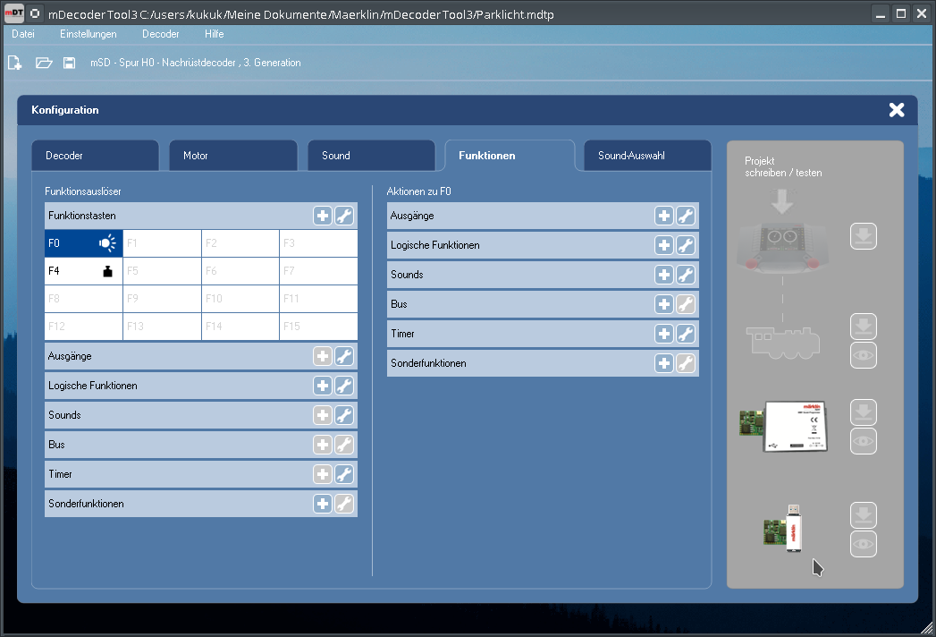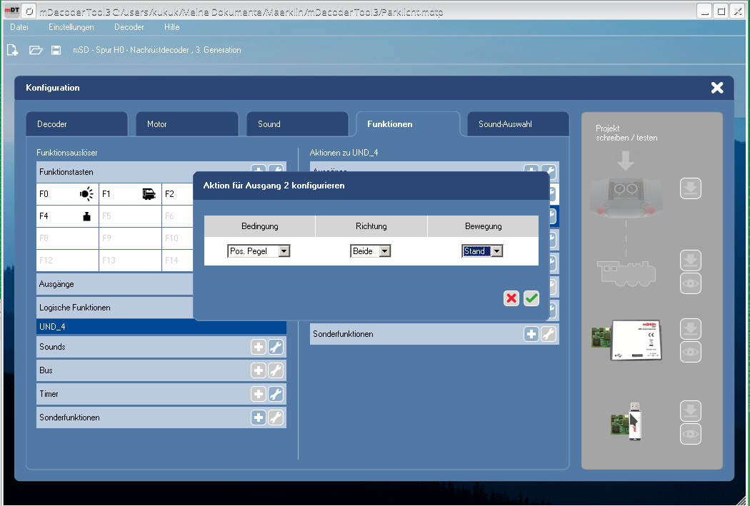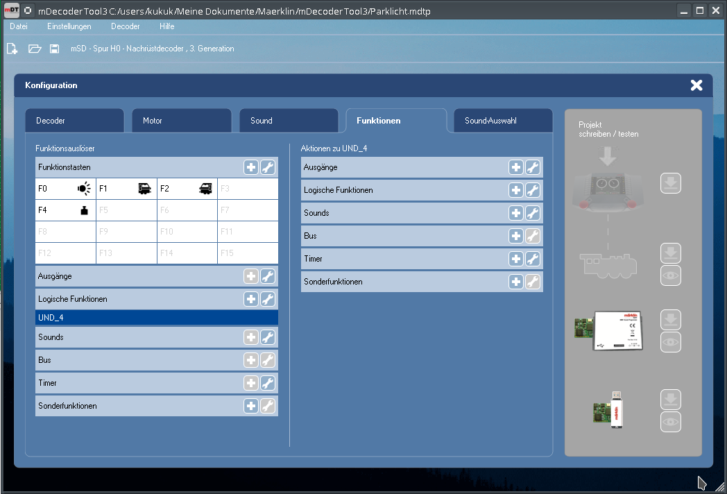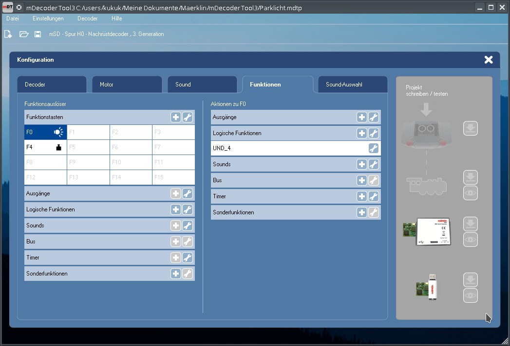 Diese Anleitung erklärt die Erstellung eines Projektes für ein “Parklicht” an Lokomotiven, sprich auf beiden Seiten soll das rote Rücklicht leuchten. Dazu soll F0 aus sein und F1 sowie F2 gedrückt sein. Dieses Projekt ist als Ergänzung für die Dunkelschaltung ausgelegt.