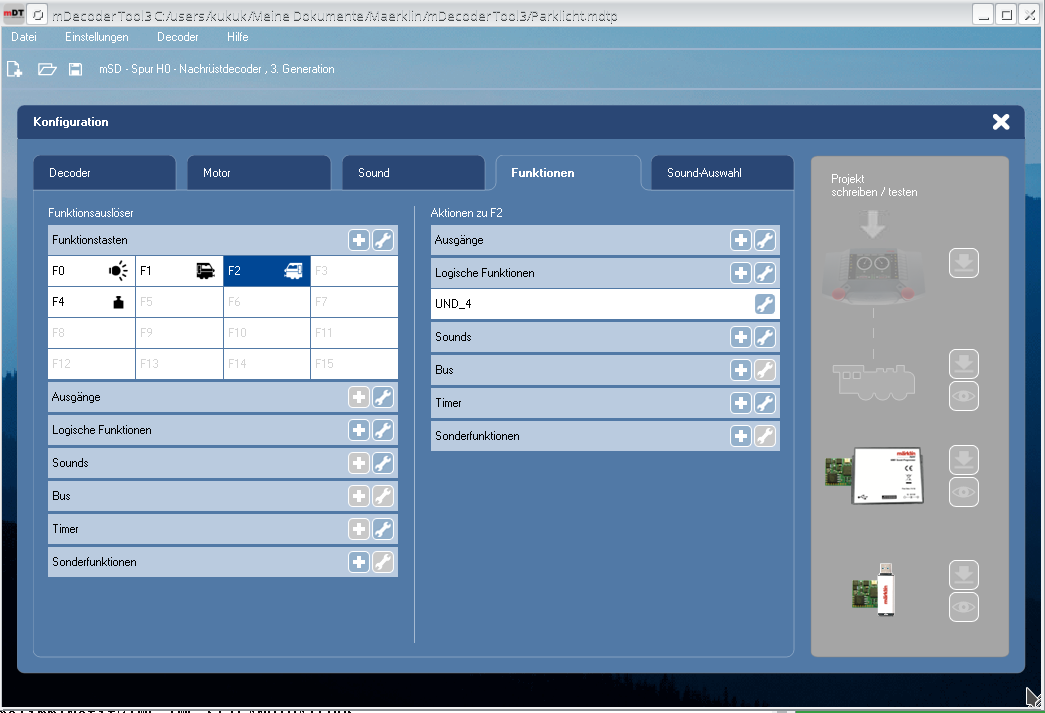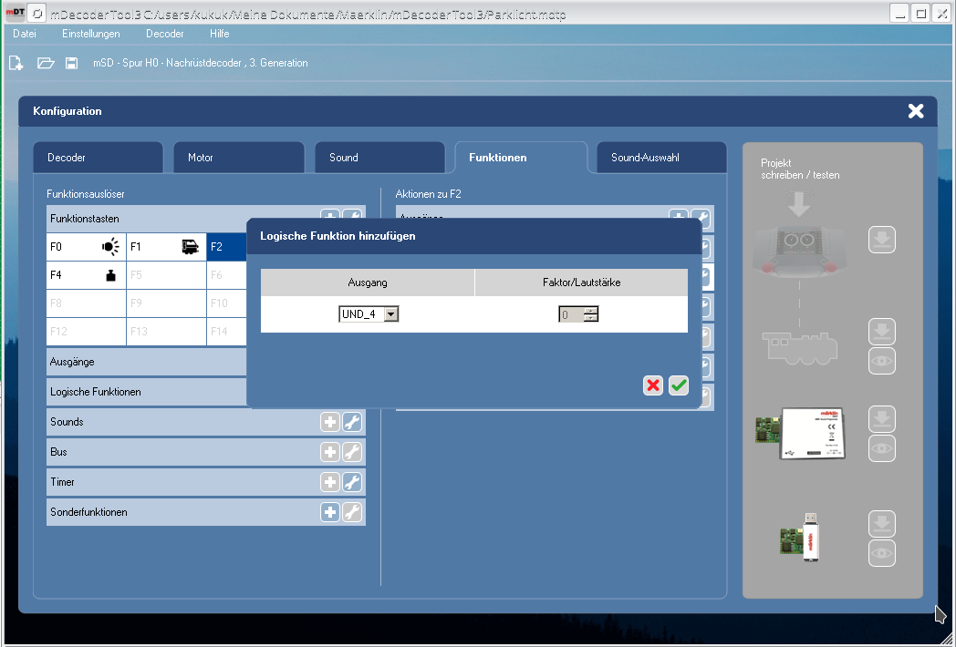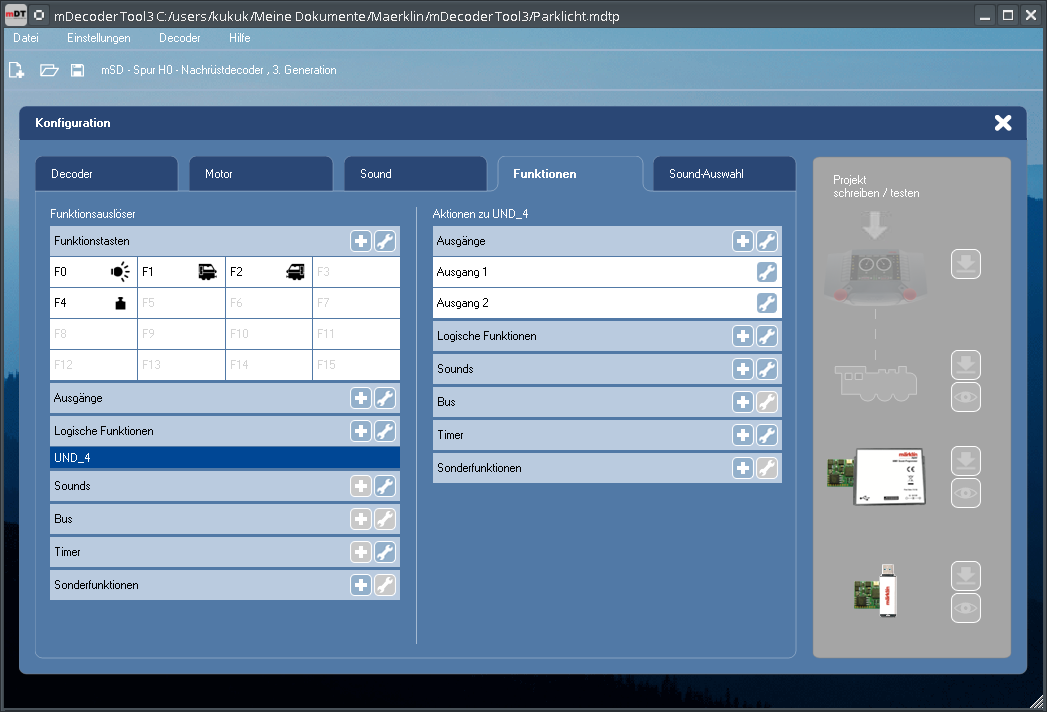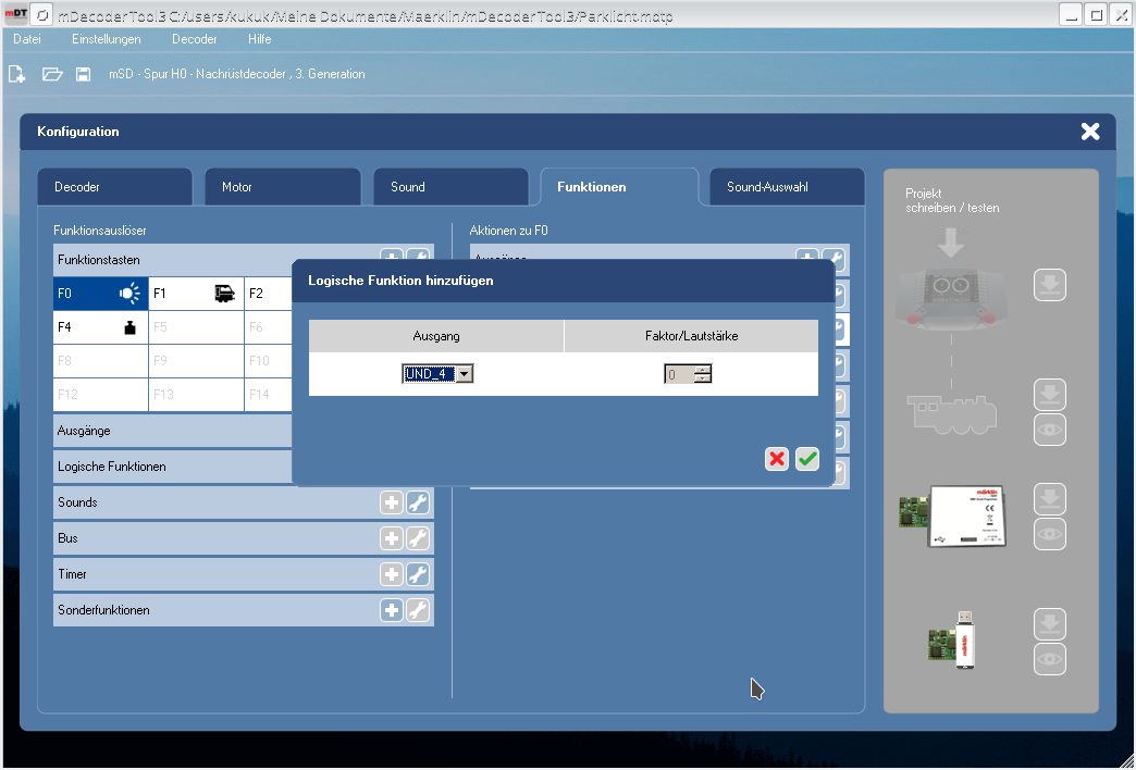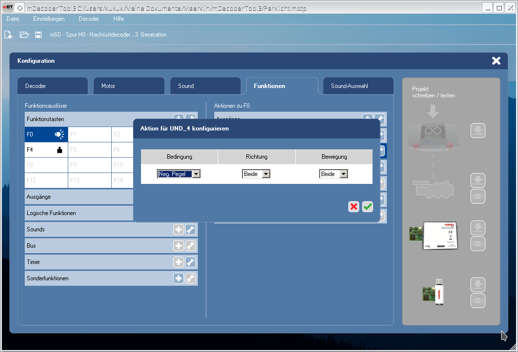 Diese Anleitung erklärt die Erstellung eines Projektes für ein “Parklicht” an Lokomotiven, sprich auf beiden Seiten soll das rote Rücklicht leuchten. Dazu soll F0 aus sein und F1 sowie F2 gedrückt sein. Dieses Projekt ist als Ergänzung für die Dunkelschaltung ausgelegt.